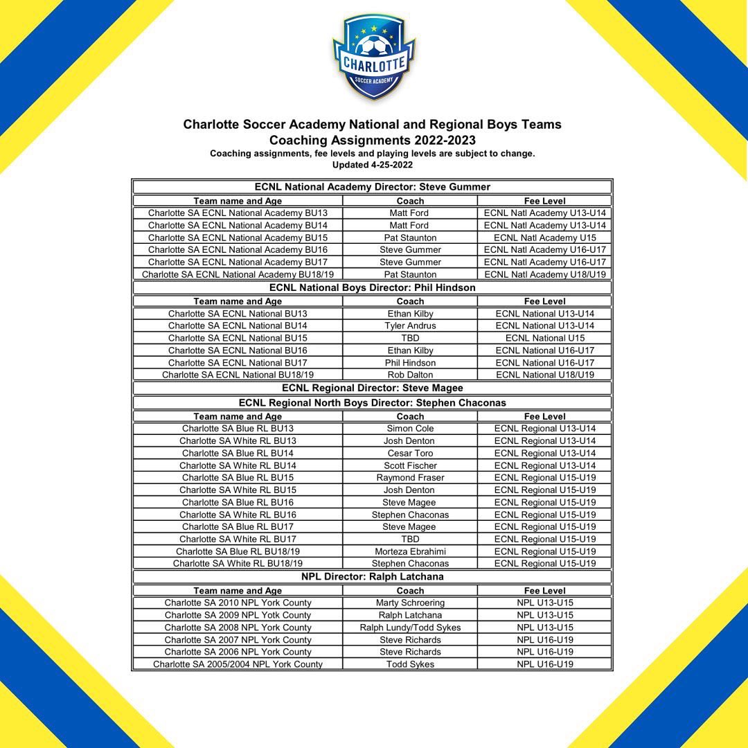 CHARLOTTE Brian Bernhardt signed his son up for Charlotte Soccer Academys spring season. 2021-2022 Charlotte Soccer Academy Club Fees U15 ECNL National Girls. Add a Player Now.